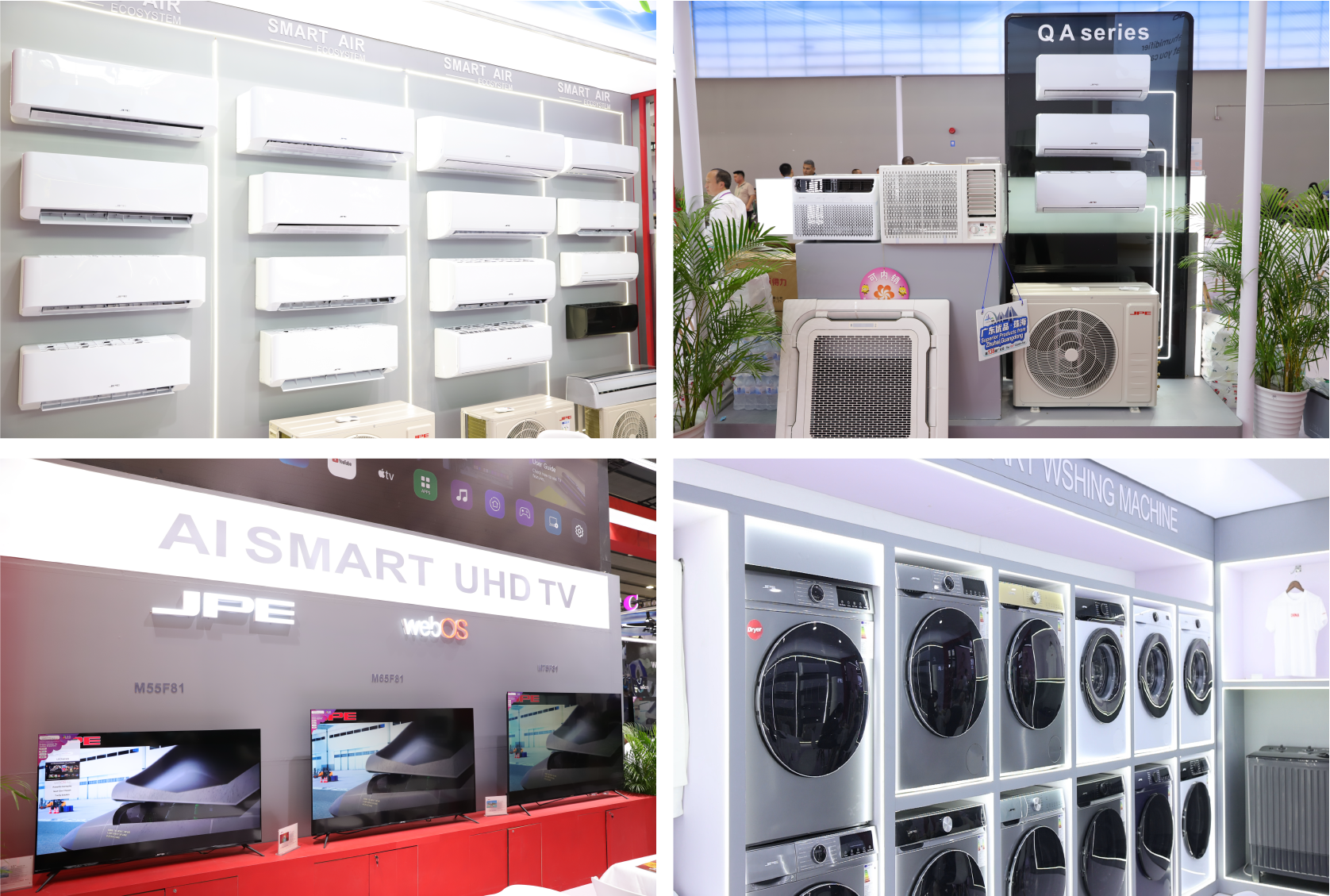 家用电器展区同样亮点纷呈。金品集团展出的壁挂分体空调(型号 5K-36K)与柜式分体空调(型号 18K-36K),涵盖定频与变频、单冷与冷暖、50Hz 与 60Hz、T1 与 T3 工况及 R410A 与 R32 环保冷媒多种类型,适配全球不同地区使用需求;